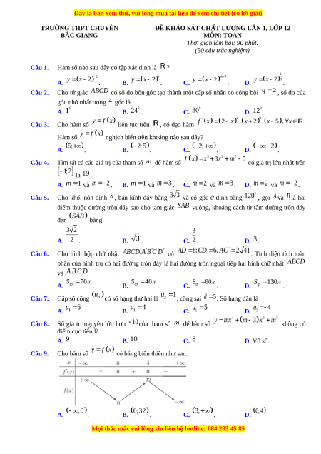 ĐỀ KHẢO SÁT CHẤT LƯỢNG LẦN 1, LỚP 12 BẮC GIANG MÔN: TOÁN