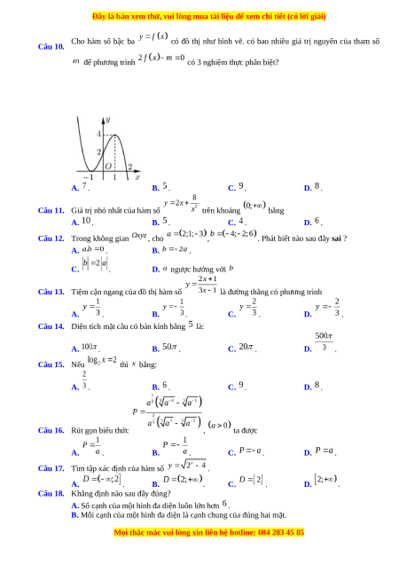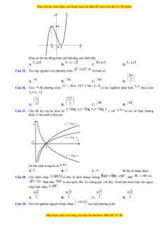 Câu 14. Diện tích mặt cầu có bán kính bằng là: A. . B. . C. . D. . Câu 15. Nếu thì bằng: A. . B. . C. . D. .