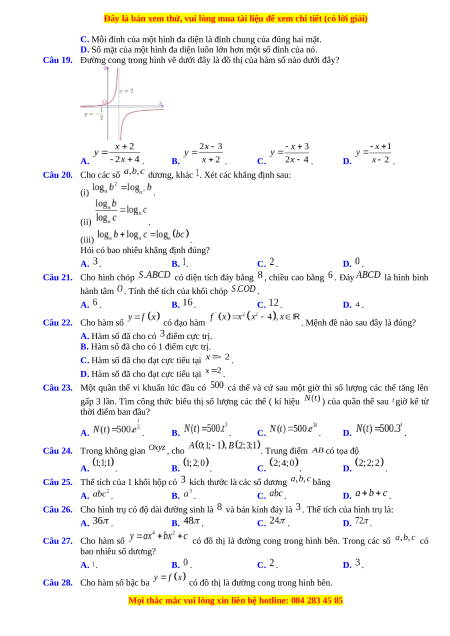 Câu 19. Đường cong trong hình vẽ dưới đây là đồ thị của hàm số nào dưới đây? A. . B. . C. . D. . Câu 20. Cho các số
