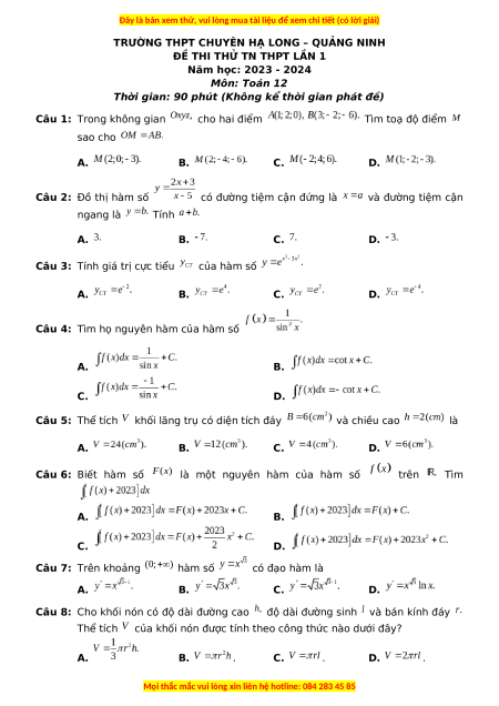 Đề thi thử tốt nghiệp Toán trường THPT Chuyên Hạ Long lần 2 năm 2024