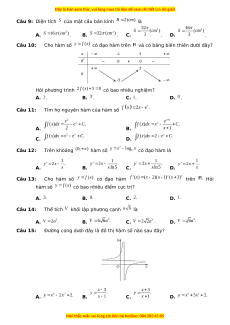 Tìm họ nguyên hàm của hàm số A. B. C. D. Câu 12: Trên khoảng hàm số có đạo hàm là A. B. C. D. Câu 13: Cho hàm số có đạo hàm trên Hỏi hàm số