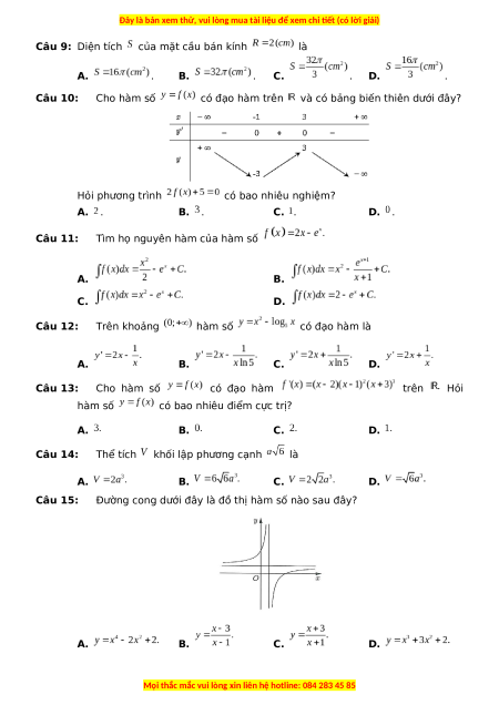 Câu 9: Diện tích của mặt cầu bán kính là A. . B. . C. . D. . Câu 10: Cho hàm số