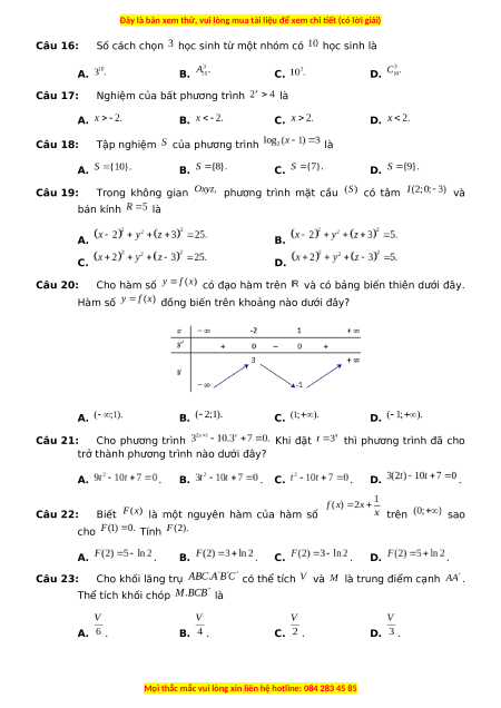 Nghiệm của bất phương trình là A. B. C. D. Câu 18: