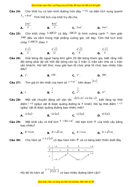 . Hỏi bán kính của khối cầu bằng bao nhiêu? A. . B. . C. . D. . Câu 30: Cho hàm số