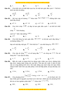 là một nguyên hàm của hàm số trên sao cho Tính A. . B. . C. . D. . Câu 23: Cho khối lăng trụ có thể tích và là trung điểm cạnh . Thể tích khối chóp là A. . B. . C. . D. .