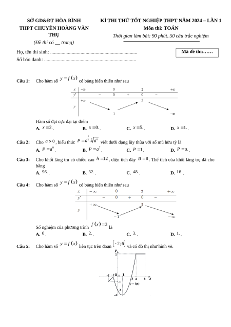 Đề thi thử tốt nghiệp Toán trường THPT Chuyên Hoàng Văn Thụ - Hòa Bình lần 1 năm 2024