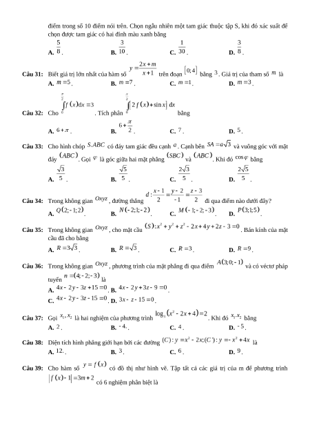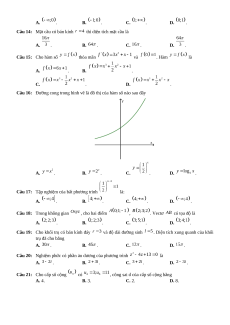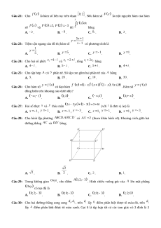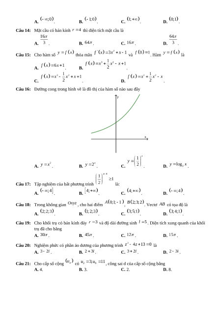 thì diện tích mặt cầu là A. . B. . C. . D. . Câu 15: Cho hàm số thỏa mãn và . Hàm là A. . B. . C. . D. .