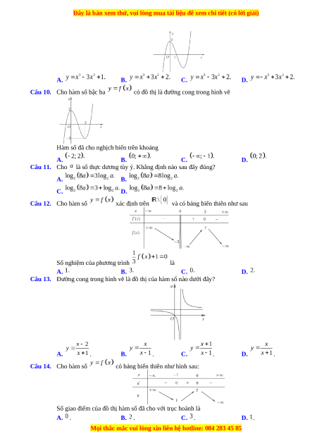Câu 13. Đường cong trong hình vẽ là đồ thị của hàm số nào dưới đây? A. . B. . C. . D. . Câu 14. Cho hàm số