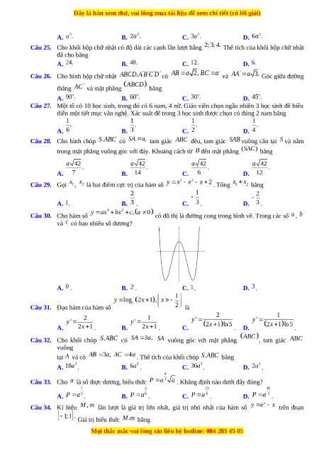 Câu 29. Gọi , là hai điểm cực trị của hàm số . Tổng bằng A. . B. . C. . D. . Câu 30. Cho hàm số