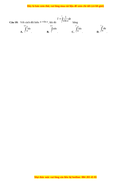 Câu 10: Với cách đổi biến , khi đó bằng A. . B. . C. . D. .