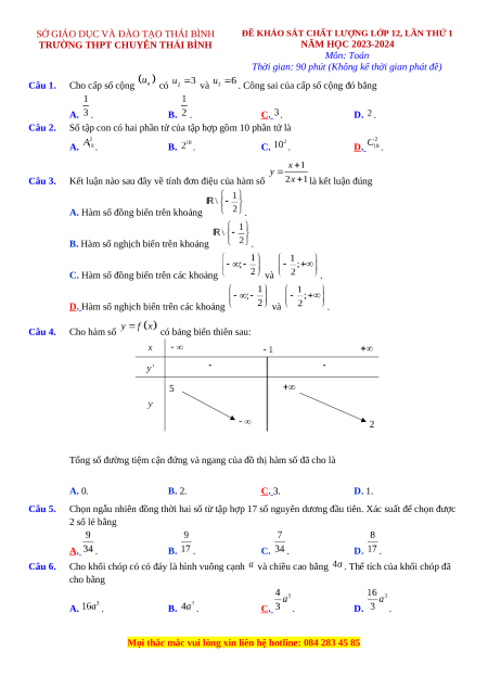 TRƯỜNG THPT CHUYÊN THÁI BÌNH NĂM HỌC 2023-2024 Môn: Toán
