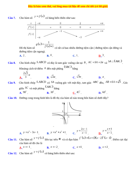 có tất cả bao nhiêu đường tiệm cận ( đường tiệm cận đứng và đường tiệm cận ngang). A. . B. . C. . D . . Câu 8. Cho hình chóp