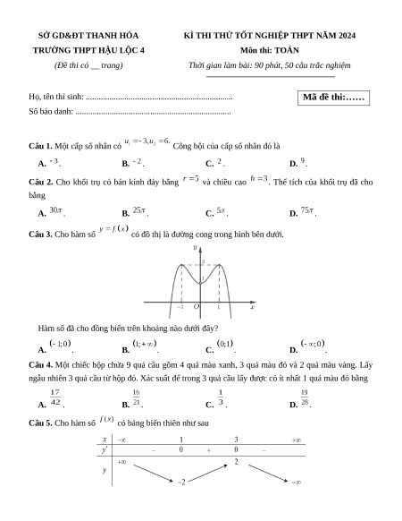 Đề thi thử tốt nghiệp Toán trường THPT Hậu Lộc 4 - Thanh Hóa năm 2024
