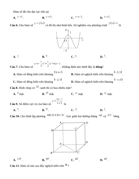 Câu 11. Hàm số nào sau đây nghịch biến trên ? A. . B. . C. . D. . Câu 12. Với