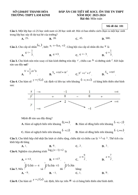 ĐÁP ÁN CHI TIẾT ĐỀ KSCL ÔN THI TN THPT TRƯỜNG THPT LAM KINH NĂM HỌC 2023-2024 Bài thi: Môn toán