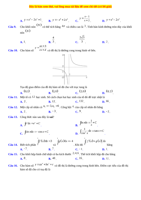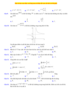 và chiều cao là . Tính bán kính đường tròn đáy của khối nón A. . B. . C. . D. . Câu 10. Cho hàm số