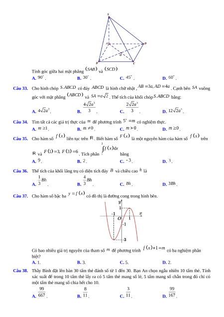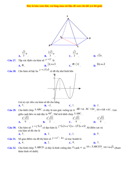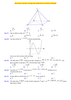 giữa cạnh bên và mặt đáy là . Thể tích khối chóp . A. . B. . C. . D. . Câu 30. Cho hàm số có đạo hàm là . Số điểm cực trị của hàm số đã cho là A. . B. . C. . D. .