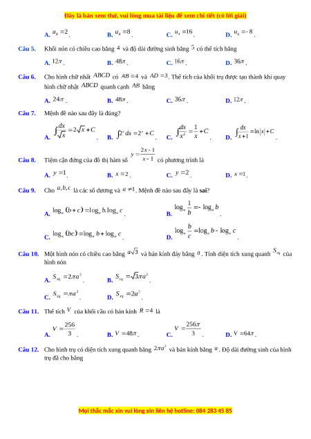 . Thể tích của khối trụ được tạo thành khi quay hình chữ nhật quanh cạnh bằng A. . B. . C. . D. . Câu 7.