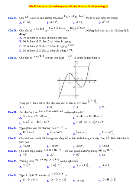 . Mệnh đề nào dưới đây đúng? A. . B. . C. . D. . Câu 29. Cho hàm số có và