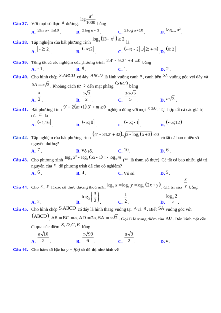 Tập nghiệm của phương trình là A. . B. . C. . D. . Câu 6. Đạo hàm của hàm số là A. . B. . C. . D. . Câu 7.