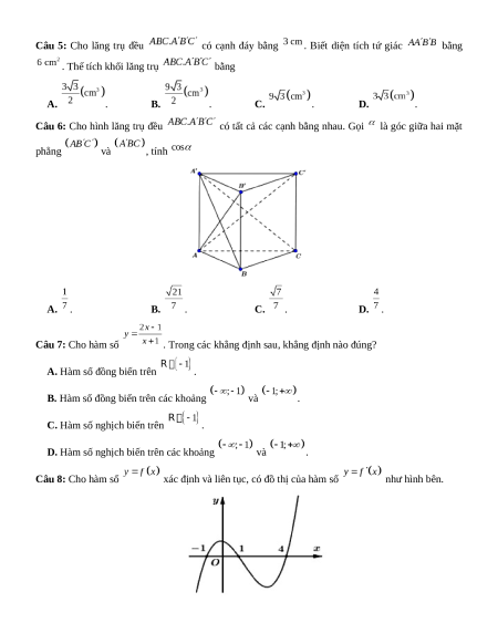 Câu 5: Cho lăng trụ đều có cạnh đáy bằng