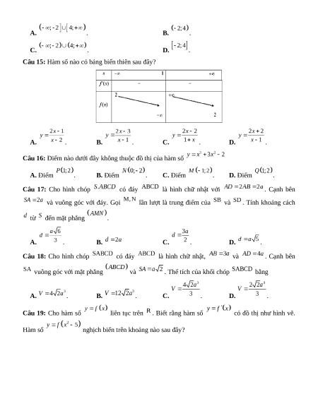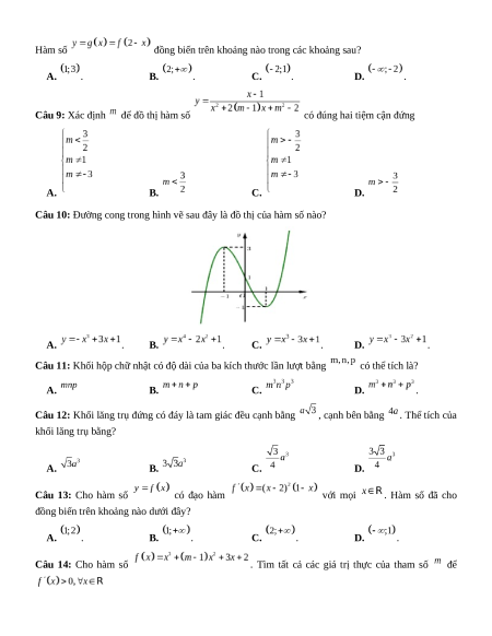 đồng biến trên khoảng nào dưới đây? A. . B. . C. . D. . Câu 14: Cho hàm số