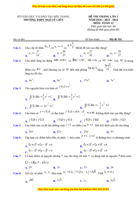 Đề thi thử tốt nghiệp Toán trường THPT Ngô Sỹ Liên - Bắc Giang năm 2024