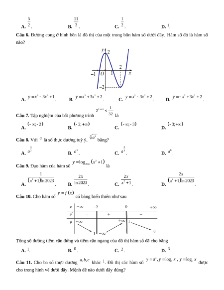 Câu 6. Đường cong ở hình bên là đồ thị của một trong bốn hàm số dưới đây. Hàm số đó là hàm số nào? A. . B. . C. . D. .