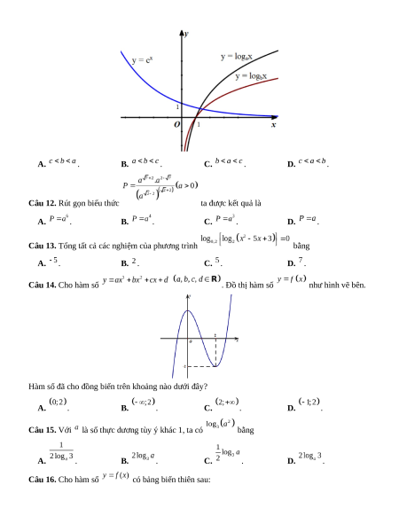 Câu 15. Với là số thực dương tùy ý khác 1, ta có bằng A. . B. . C. . D. . Câu 16. Cho hàm số có bảng biến thiên sau:
