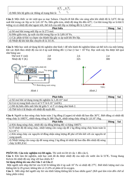 khí xác định theo nhiệt độ của nó ở áp suất không đổi 1,5 bar (1 bar = 105 Pa). Học sinh này thu được kết quả như bảng sau: Thể tích V (ml) 2,8 2,6 2,4 Nhiệt độ T (K) 350 325 300 Hình 1 Hình 2 Phát biểu Đúng Sai