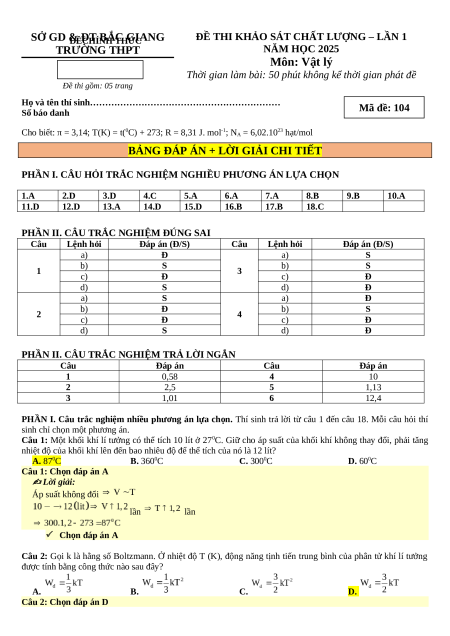 Đề thi thử tốt nghiệp Vật lí 2025 Sở GD và DT Bắc Ninh