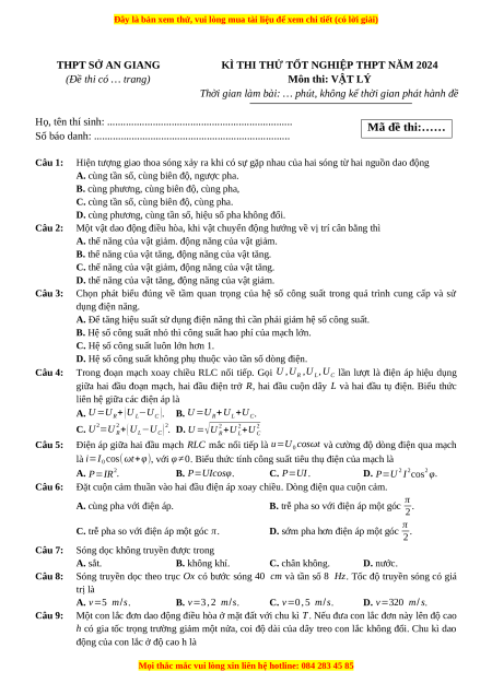 Đề thi thử tốt nghiệp Vật lí Sở An Giang năm 2024