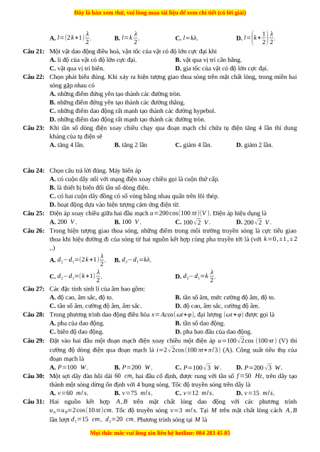 Câu 20: Điều kiện có sóng dừng trên sợi dây có chiều dài l một đầu cố định, một đầu tự do là (với