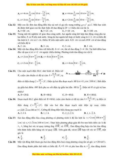 Câu 31: Hai nguồn kết hợp A , B trên mặt chất lỏng dao động với các phương trình