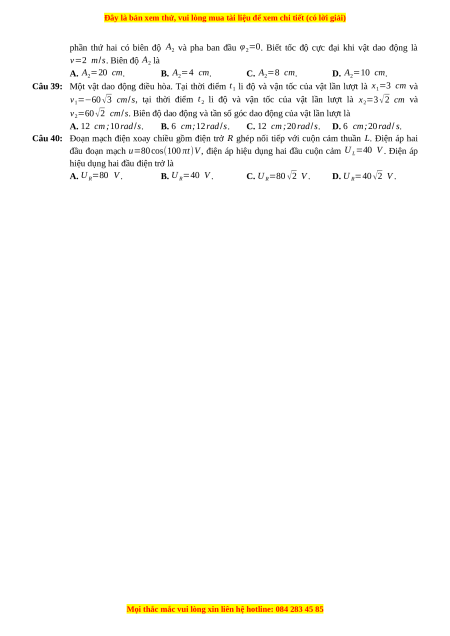 Câu 38: Một vật đồng thời tham gia hai dao động điều hoà cùng phương cùng tần số góc ω=20 rad/ s.