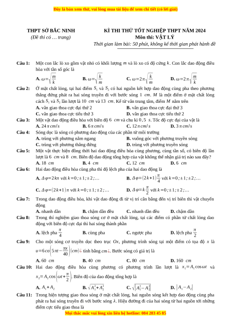 Đề thi thử tốt nghiệp Vật lí Sở Bắc Ninh lần 2 năm 2024