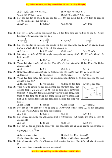 Câu 14: Một con lắc đơn có chiều dài của sợi dây là 1 m dao động điều hòa tại nơi có gia tốc trọng
