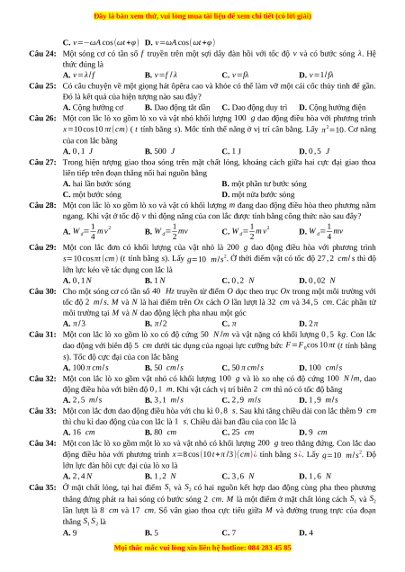 Câu 27: Trong hiện tượng giao thoa sóng trên mặt chất lỏng, khoảng cách giữa hai cực đại giao thoa