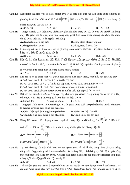 Câu 20: Dao động của một vật có khối lượng 100 g là tổng hợp của hai dao động cùng phương có