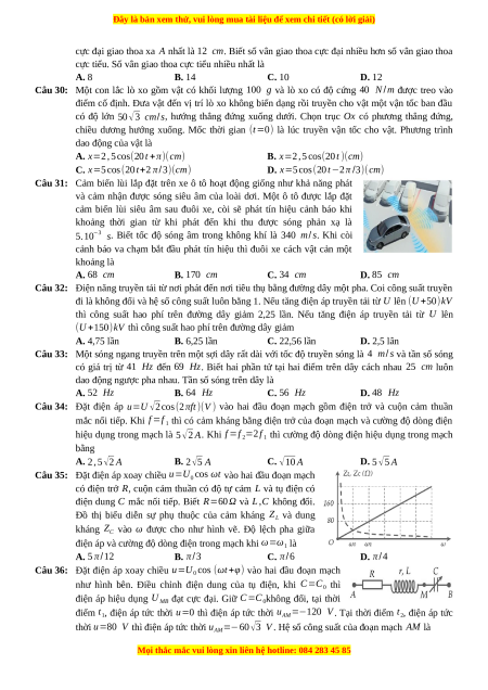 Câu 34: Đặt điện áp u=U √2cos(2πft)(V ) vào hai đầu đoạn mạch gồm điện trở và cuộn cảm thuần