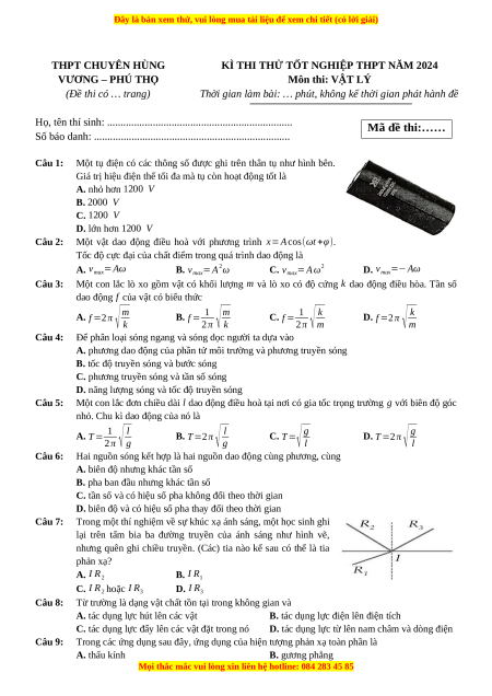 KÌ THI THỬ TỐT NGHIỆP THPT NĂM 2024 VƯƠNG – PHÚ THỌ Môn thi: VẬT LÝ
