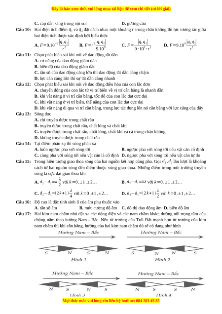 Câu 15: Trong hiện tượng giao thoa sóng của hai nguồn kết hợp cùng pha. Gọi d , d 1 2 lần lượt là khoảng