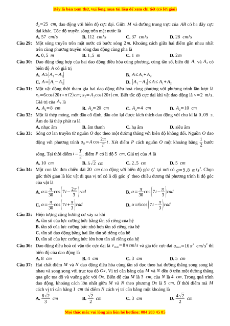 Câu 36: Dao động điều hoà có vận tốc cực đại là v =8 π cm/s max