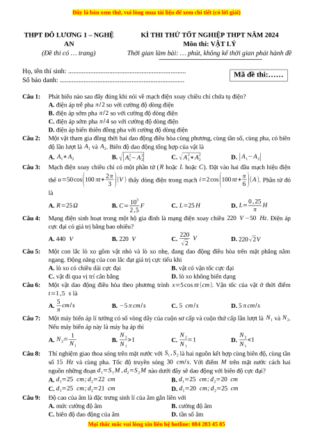 Đề thi thử tốt nghiệp Vật lí trường THPT Đô Lương 1 - Nghệ An năm 2024