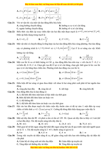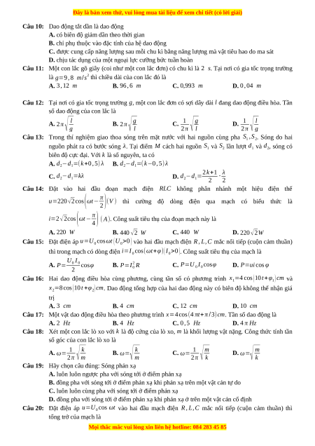 Câu 25: Điều kiện để hai sóng cơ giao thoa được với nhau là hai sóng phải xuất phát từ hai nguồn dao động A. cùng pha ban đầu B. cùng tần số C. kết hợp D. cùng biên độ
