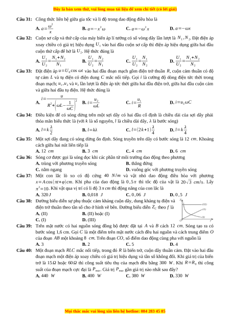 Câu 34: Điều kiện để có sóng dừng trên một sợi dây có hai đầu cố định là chiều dài của sợi dây phải