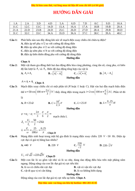D. điện áp biến thiên đồng pha với cường độ dòng điện Câu 2: