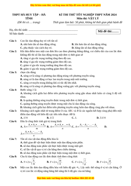 KÌ THI THỬ TỐT NGHIỆP THPT NĂM 2024 TĨNH Môn thi: VẬT LÝ