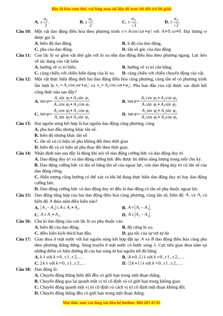 Câu 13: Hai nguồn sóng kết hợp là hai nguồn dao động cùng phương, cùng
