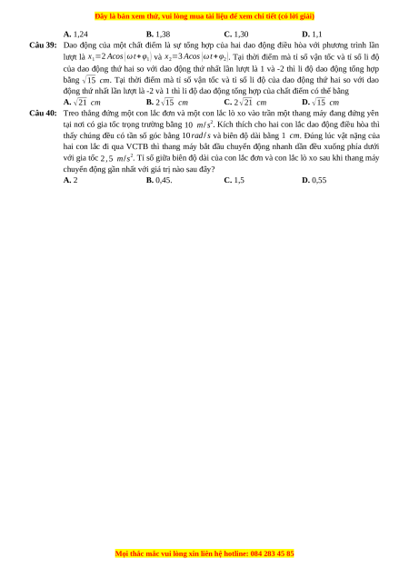 Câu 31: Con lắc đơn có chiều dài l, trong khoảng thời gian Δt thực hiện được 40 dao động. Nếu tăng